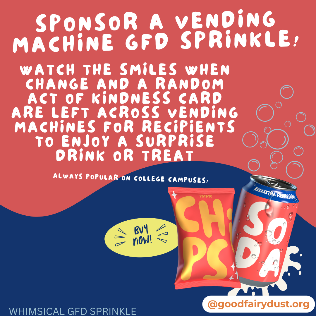 You can help GFD sprinkle smiles in unexpected places. By sharing just a bit, you can become a vending machine fairy! GFD volunteers wil generate random bits of change left on a vending machine, with a card that explains who GFD is, and to encourage the recipient to ‘pay it forward’.